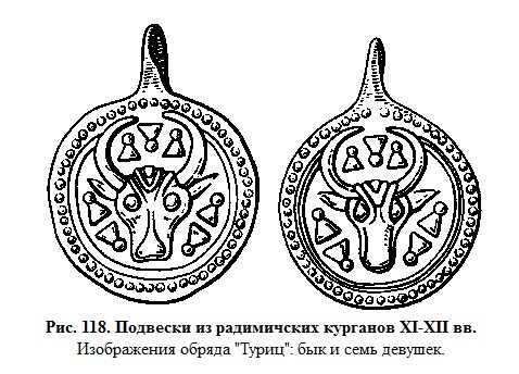 На Руси в некоторых южных деревнях сохранился обряд «Турицы».  Созвездие Тельца  у древних славян называлось Волосом или Туром (ср. лат. Taurus).  В бывшей Калужской губернии девушки на праздник надевали головной убор с огромными рогами, и священники не пускали таких невест в церковь.  Вот такие подвески были найдены  археологами в захоронениях древних славян.