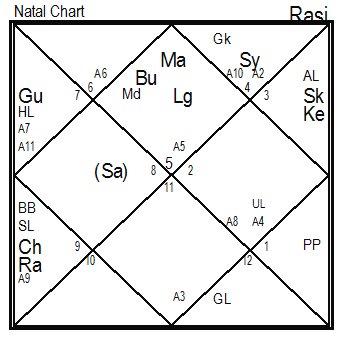 Луна в карте писателя находится в 5 доме (творчество, интеллект) в накшатре Пурвашадха, 2-й паде в соединении с Раху в Муле. Соединение Луны с Раху дает желание экспрессии и публичности. Луна – единственная планета, которая по градусам выходит за пределы Кала Сарпа йоги, когда все планеты находятся между кармическими узлами Раху и Кету. Обычно такая планета дает яркий результат, «тащит» весь гороскоп и ведет к реализации желаний личности. Луна как хозяйка 12 дома – воображение, сны, скрытые таланты, «терра инкогнита» – дает писателю возможность видеть и чувствовать пространство, внутренний и внешний океан и выражать это через писательскую паду Меркурия.
