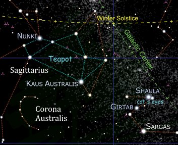 Если смотреть на Млечный Путь, рядом, в середине созвездия Стрельца, можно разглядеть три звезды, почти ровно расположенных в ряд. Самая яркая из них — Каус Аустралис. Ее название переводится как «южная часть лука». Остальные звезды носят названия Каус Меридионалис (средняя часть лука) и Каус Бореалис (северная часть лука). Вместе они образуют лук Стрельца.