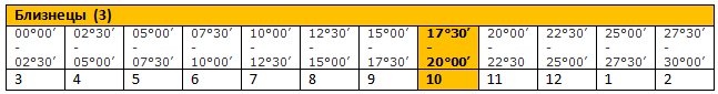 Отсчет двадашамш начинается с того же знака, который мы делим. Например, перед нами карта с восходящими Близнецами, лагна 18 градусов 45 минут.
