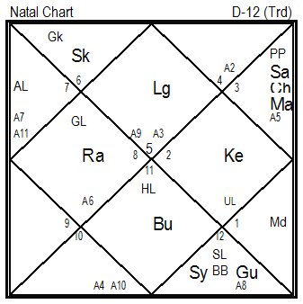 Двадашамша королевы показывает,что родовая карма в выборе партнера связана с прошлым. На это указывает Венера, хозяйка 7 дома, которая находится в 12 доме с узлом Кету. Как известно, Кету в D-12 связан с прошлой кармой, заслугами и долгами рода. 12 дом в Двадашамше обладает совокупным значением – весь род в целом, прошлое рода, заслуги рода. Дополнительным значением может быть супруг из-за границы. Поскольку Венера сильная, это будет указывать на достаточно благоприятную карму. Аспекты Раху и ретроградного Сатурна на 7 дом будут проявляться как родовые ограничения (Сатурн) через супружескую жизнь и одновременно желание чего-то неординароного, выход за рамки (Раху). В 7 доме в раси чакре королевы мы также видим Раху в Близнецах, что говорит о возможных неординарных решениях в выборе партнеров, общительности и эрудированности ее избранников, множественных контактах, желании активно проявить себя в общении и отношениях.