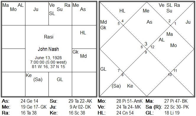 Джон Нэш — восходящие Близнецы, лагнеш Меркурий в Ардре в 1 доме, в навамше Рыб.