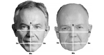 На рисунке видно, насколько различны эти лица по геометрическим параметрам. У Тони Блэра лицевой индекс 91,9 — лептопросопик. У Уильяма Хейга лицевой индекс 81,5 — юропросопик.